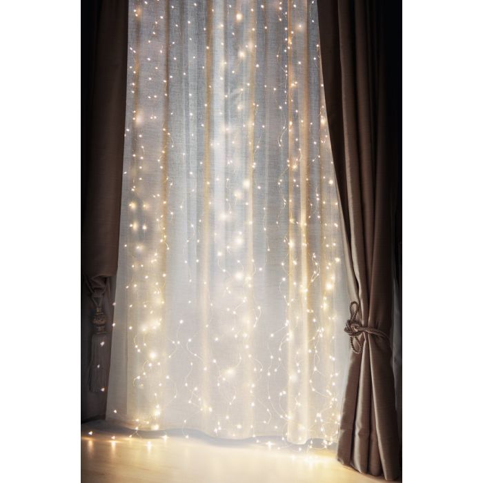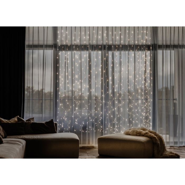 Valosävyltään lämmin valkoinen LED-valoverho on kodikas ja lämmin.