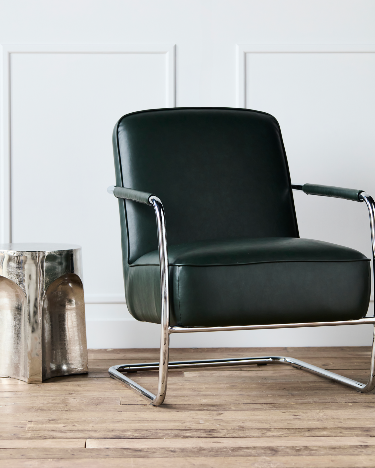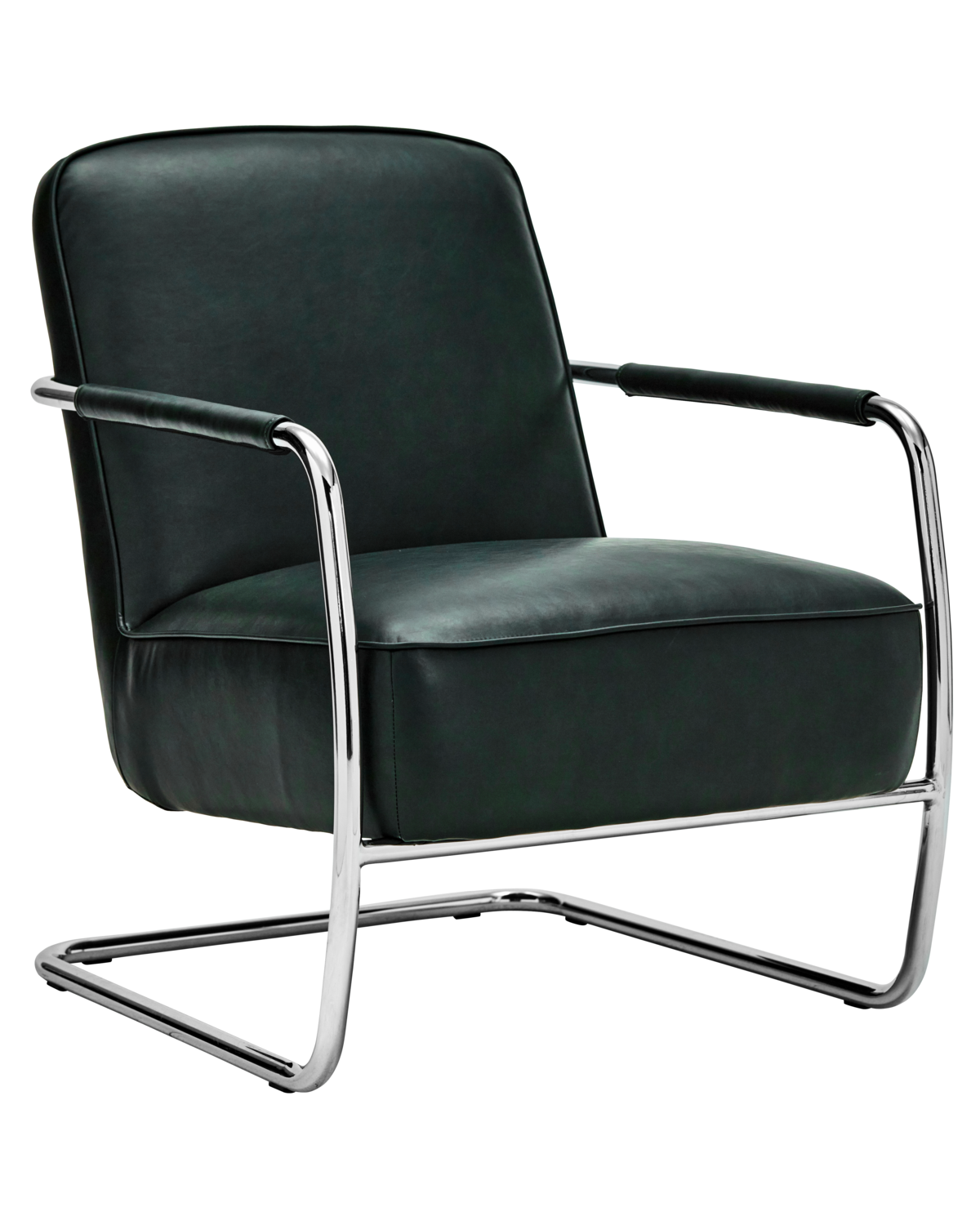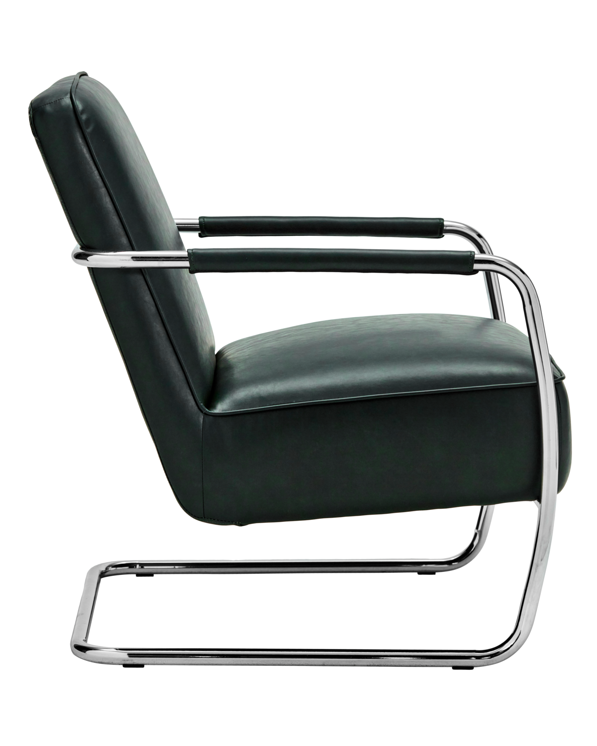 Trendikäs lounge tuoli, missä voit viettää vaikka tunteja, koska tuolissa on niin mukava istuskella. Tuolin jalat ovat tyylikästä terästä ja päällinen on kestävää nahalta näyttävää polyesteriä.