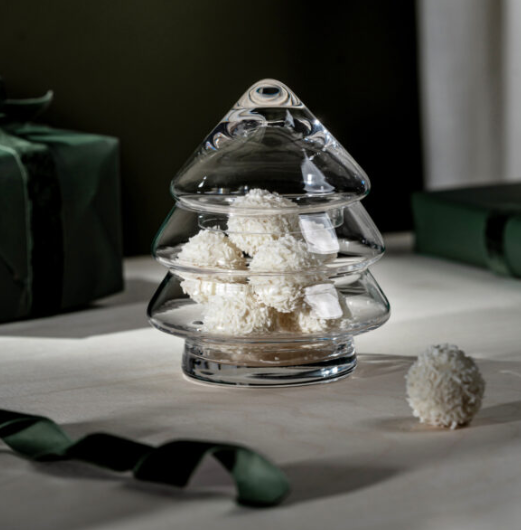 Joulukuusen tuttu muoto yhdistettynä säilytysrasian toiminnallisuuteen. Tarjoile konvehdit ja muut herkut tyylikkäästi Kuusi-lasipurkista! Pieni koko soveltuu lisäksi esimerkiksi glögitarjoilussa rusinoiden ja manteleiden esillepanoon.