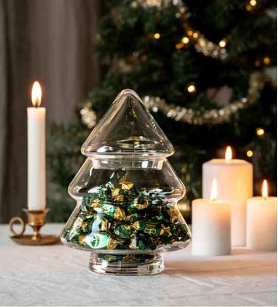 Joulukuusen tuttu muoto yhdistettynä säilytysrasian toiminnallisuuteen. Säilö konvehdit, keksit ja muut herkut tai jouluvalot tyylikkäästi Kuusi-lasipurkkiin!