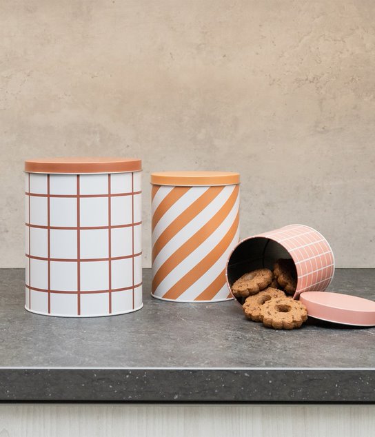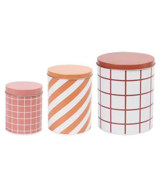 Ruudut & Raidat -tuotesarjan säilytyspurkit tarjoilevat minimalistisia linjoja ja leikkisiä värejä kodin säilytykseen sekä sisustukseen. Setti sisältää 3 eri kokoista purkkia, joiden korkeudet ovat 14 cm, 17 cm ja 20 cm.